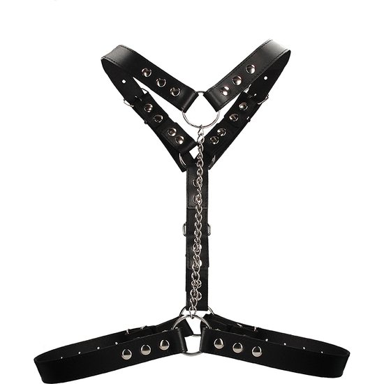 El arnés está hecho de cuero de calidad superior y acero inoxidable y tiene dos juntas tóricas robustas por delante, para acoplar fácilmente pesas, cadenas u otros accesorios sado.