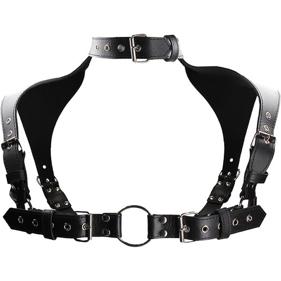 Este arnés está hecho con hombreras de cuero negro gruesas que llaman la atención y rezuman fuerza y masculinidad, mientras que el collar que incorpora con una hebilla de ajuste metálica simplifica el juego.