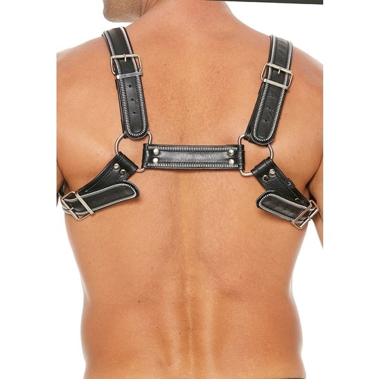 Las cuatro correas ajustables con hebillas resistentes hacen que el arnés tenga un ajuste perfecto y cómodo a la vez que le da un aspecto masculino y dominante.
