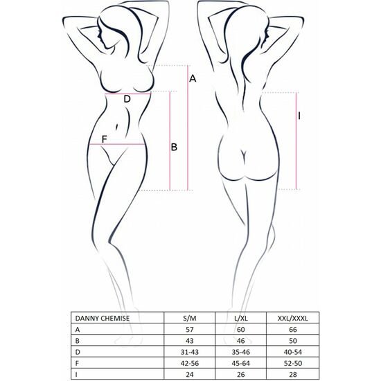 NOTA: La tabla de tallas indica las medidas en centímetros, siendo las letras D y F la medida de bajo pecho y cadera respectivamente, pero no del contorno. Para saber el contorno, se debe multiplicar por 2.