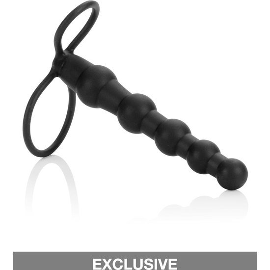 El eje flexible presenta una selección de cuentas suaves y graduadas que proporcionan un placer intenso. Para una inserción cómoda y placentera, el eje del penetrador también tiene bucles elásticos que se deslizan sobre el pene erecto y brindan soporte testicular.
