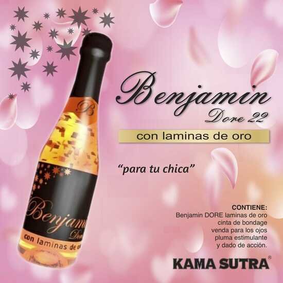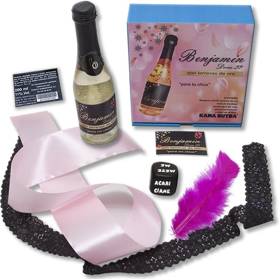Es un ESTUCHE con un BERJAMIN DORE CON LAMINAS DE ORO DE 22 KILATES de carácter afrutado, fresco y joven, compuesto por un vino espumoso muy selecto CON LAMINAS DE ORO de 22 KILATES PARA TU CHICA Y ademas contiene el JUEGO DE LAS ANILLAS que tirando las anillas y acertando dentro del berjamin el jugador QUE MAS ACIERTE tendra un privilegio en utilizar los ARTICULOS CUANDO QUIERA mas contiene una CINTA DE BONDAGE, VENDA PARA LOS OJOS, PLUMA ESTIMULANTE Y 1 un DADO de 30 x 30 mm blanco nuclear de gran calidad de ACCION.