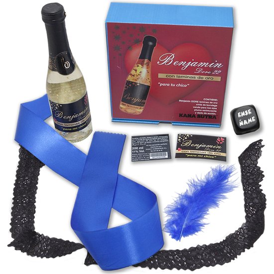 Es un ESTUCHE con un BERJAMIN DORE CON LAMINAS DE ORO DE 22 KILATES de carácter afrutado, fresco y joven, compuesto por un vino espumoso muy selecto CON LAMINAS DE ORO de 22 KILATES PARA TU CHICO