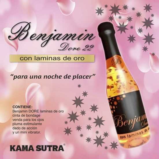 Es un ESTUCHE con un BERJAMIN DORE CON LAMINAS DE ORO DE 22 KILATES de carácter afrutado, fresco y joven, compuesto por un vino espumoso muy selecto CON LAMINAS DE ORO de 22 KILATES PARA UNA NOCHE DE PLACER