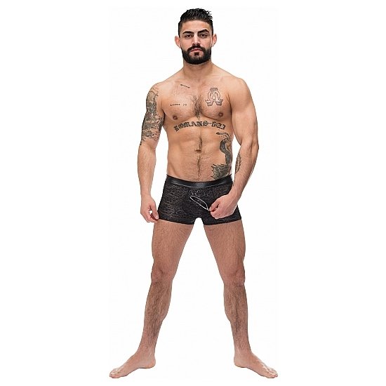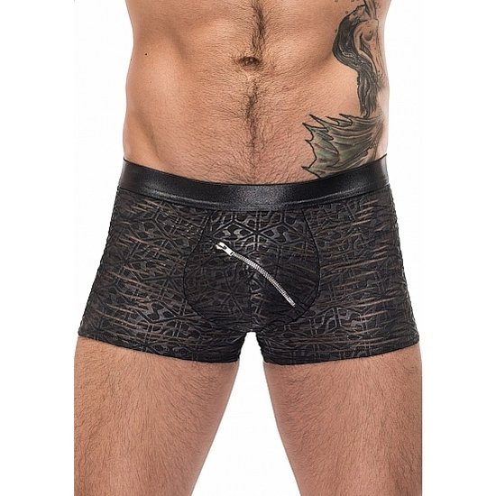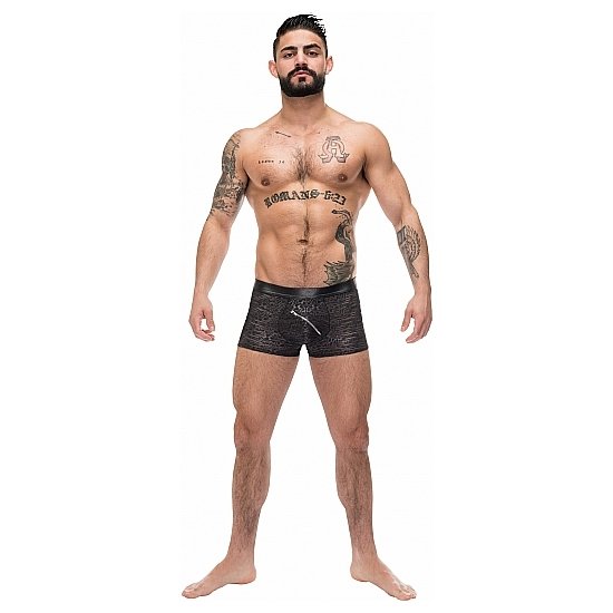 Zip Pouch Short presenta una cremallera de bolsa diagonal con solapa protectora, bolsa contorneada, cintura adelgazante de aspecto mojado. Tejido quemado semitransparente con un patrón abstracto tono sobre tono. Ligero y transpirable con estiramiento total.