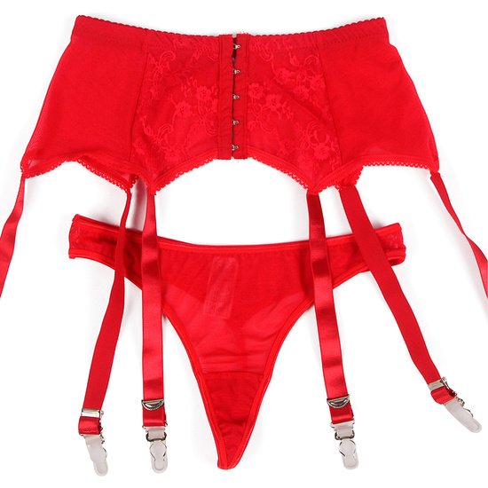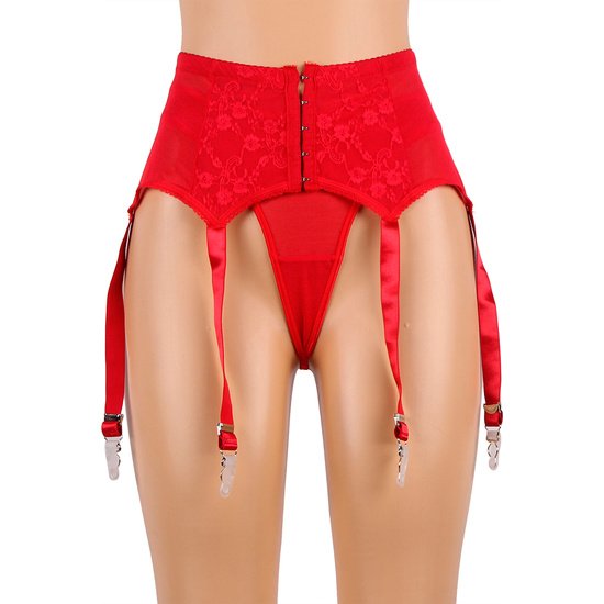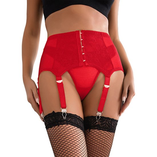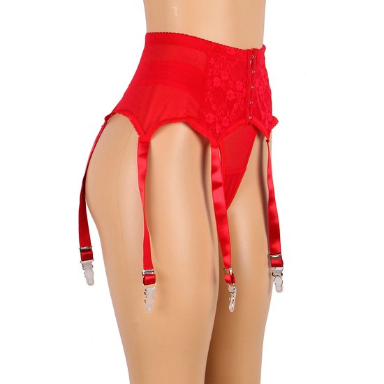 BRAGUITA DE ENCAJE ROJO ELÁSTICO CON CINCO GANCHOS Y OJALES