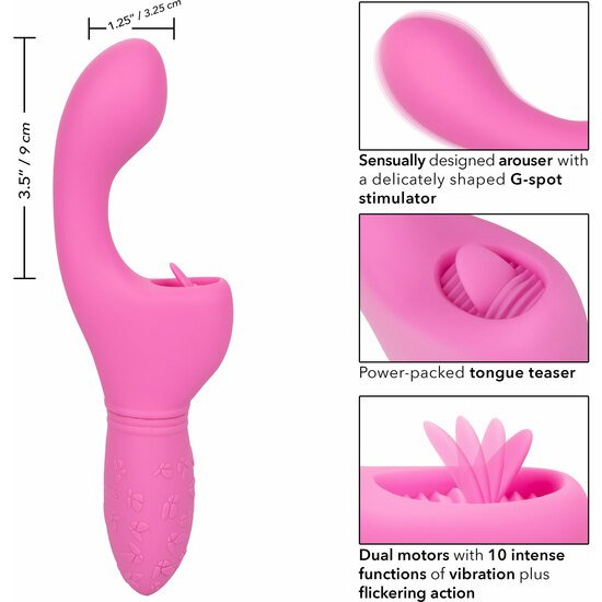 El estimulador lingual del excitador revolotea más rápido con cada aumento de la vibración para hacer cosquillas en los puntos dulces externos.