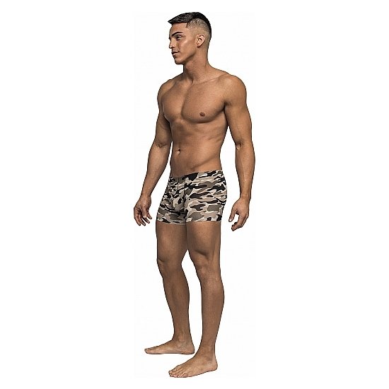 De la colección Commando de Male Power, este modelo incluye: Un mini short con estampado de camuflaje con cintura de talle bajo, piernas con corte a la mitad del muslo, bolsa contorneada con costuras decorativas y dobladillo y cintura sin costuras. Tela estampada de camuflaje tradicional suave y elegante. Pegado con muy pocas costuras, elástico y transpirable.