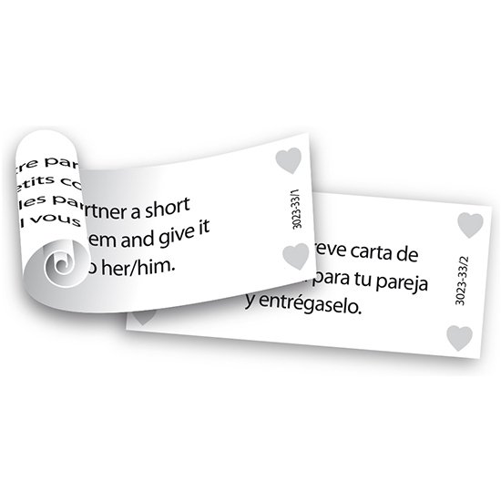 ‘Corazón Romántico’es un juego erótico para ti y tu pareja. Tú o tu pareja sacáis con ayuda de las pinzas un rollito del corazón. ¿Qúe es lo que va a pasar? ¿Se tratará de una deliciosa velada juntos o de una noche íntima y ardiente?