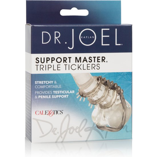 Satisfaz tus deseos con el Dr. Joel Kaplan Support Master Triple Ticklers. El realzador sensual está adornado con excitantes teasers y proporciona una combinación de pene y soporte testicular para una colocación de manos libres alucinante.