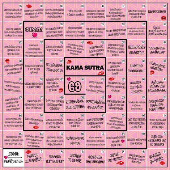 DIVERTIDO JUEGO PARA DISFRUTAR EN PAREJA O CON AMIGOS. EL JUEGO CACHONDO se juega como el juego de la oca tradicional. Se va tirando el dado y avanzando tanto como éste te indique. Pero cada casilla tiene un prueba para quien caiga en ella y si alguien se niega a realizarla debera pagar con una prenda. El jugador ganador sera el que llegue al numero 69, Tambien tiene prueba de objetos que habra de hacerlas.