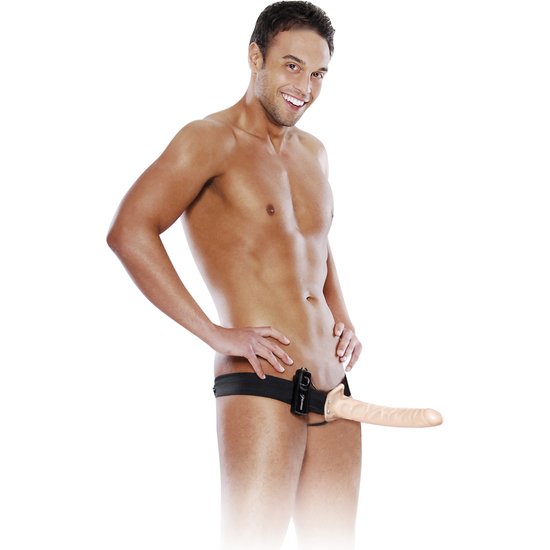FETISH FANTASY 25,5 CM VIBRATING HOLLOW STRAP ON, es un fantástico arnés hueco para hombre en color carne con vibrador. Fabricado con PVC de primera calidad, libre de Phalatos, pertenece a la colección FETISH FANTASY SERIES.