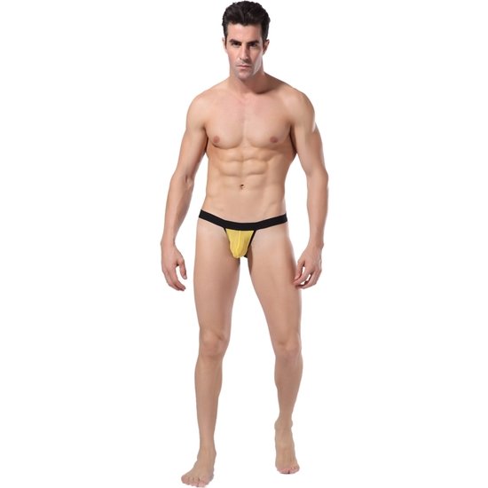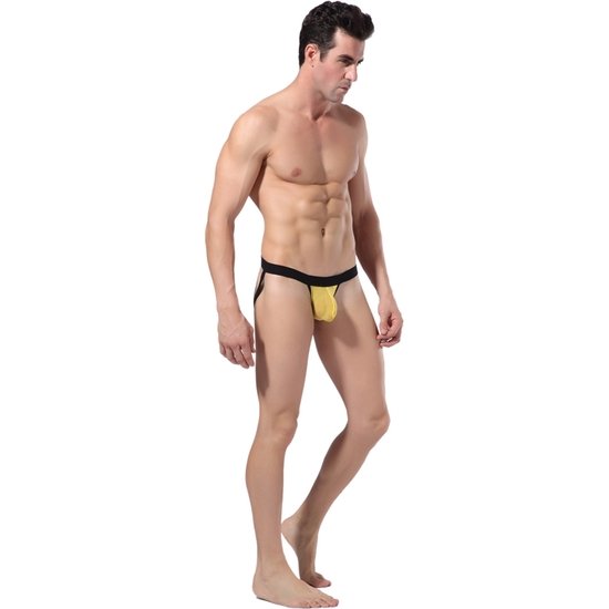 Suspensorio de color amarillo combinado con negro. La cintura es ancha y elástica para acomodarse a tu cuerpo.