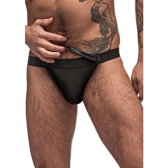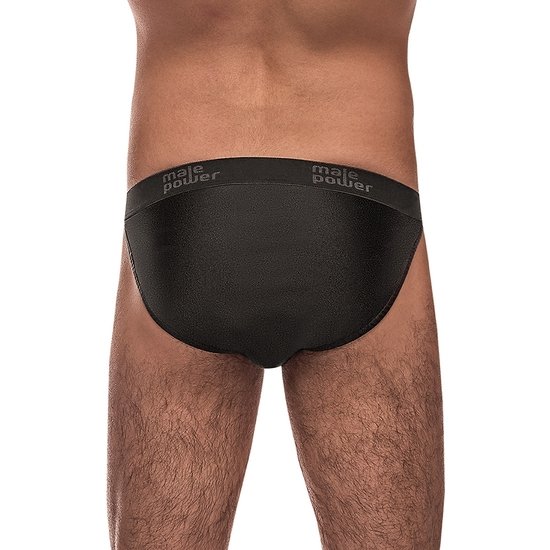 De la colección Grip & Rip de Male Power, este estilo incluye: Un bikini rip off con una bolsa frontal separable con lengüetas de velcro, correa de agarre desprendible, parte trasera de cobertura total y cintura elástica con la marca en relieve tono sobre tono.