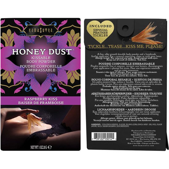 Extraído de miel pura, estos delicados y finos polvos dejan la piel suave y sedosa. Acaricia el cuerpo de tu amante con este plumero hecho a mano y acompáñalo con dulces besos de sabores.