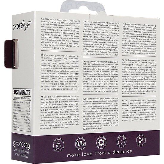 G-SPOT EGG WIRELESS CONTROLED SMALL SIZE PURPLE este huevo vibrador dispone de 10 diferentes posiciones muy estimulantes y de una forma peculiar que estimulará tu punto G. Podrás ajustar su intensidad de vibración sin necesidad de cables.