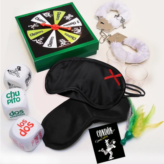 Contenido: Esposas, llaves, Plumero, Juego 3 Dados eróticos, 2 Antifaces, 2 chupitos, Condón Kamasutra, caja ruleta tapa.