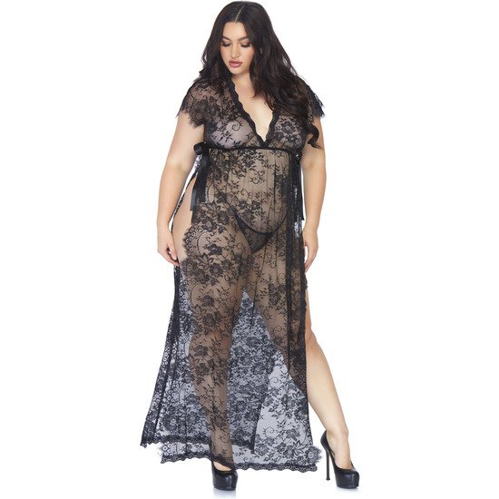 2 pzs El conjunto incluye un largo caftán de encaje con pestañas, cinta de satén y tanga a juego.