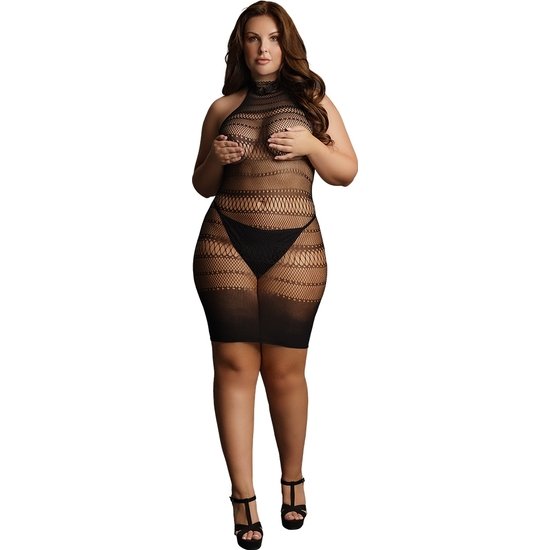 Vestido minifalda de cuello alto, con sexy red de rayas y patrón de encaje. La tela suave súper elástica se ajustará desde la talla XXL hasta la talla 5XL.