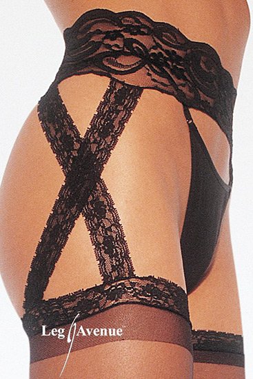 LEG AVENUE SHEER LACE TOP STOCKINGS WITH ATTACHED CRISS CROSS LACE GARTERBELT.