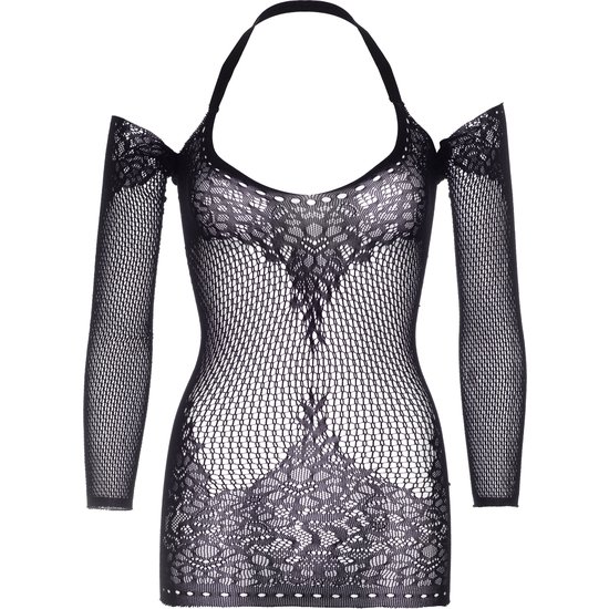 Minivestido de encaje y red sin costuras con mangas largas y cuello halter cruzado.