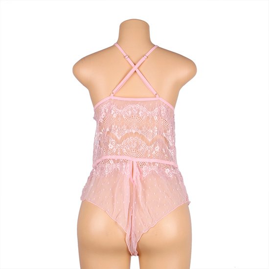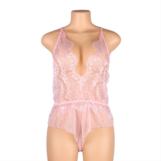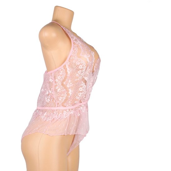LENCERÍA TRANSPARENTE CON ESCOTE EN V PROFUNDO FLORAL DE ENCAJE ROSA