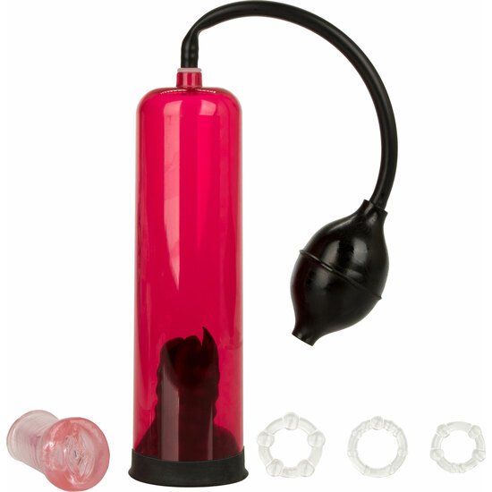 Esta colección de placer incluye una poderosa bomba de succión, tres anillos elásticos, una manga de masturbación inductora de orgasmo y lubricante para hacer que tu juego sea suave y húmedo.