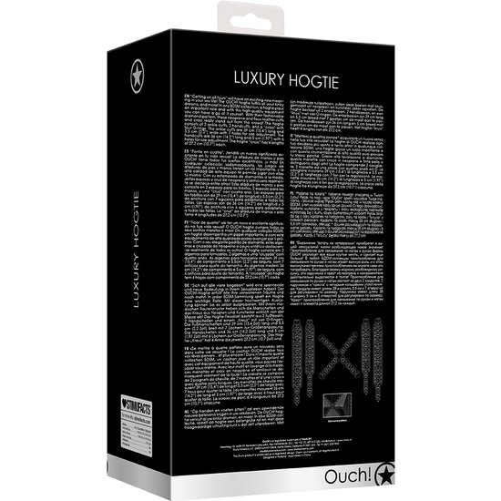Las esposas para los tobillos son de 39 cm (15,4”) de longitud y 5,5 cm (2,2”) de anchura con 7 agujeros para adaptarlas a todas las tallas. Las esposas son de 36 cm (14,2”) de longitud y 5 cm (1,97”) de anchura con 6 agujeros para adaptarlas a todas las tallas. La “cruz” de atadura de manos y pies tiene 4 longitudes de 27,2 cm (10,7”)