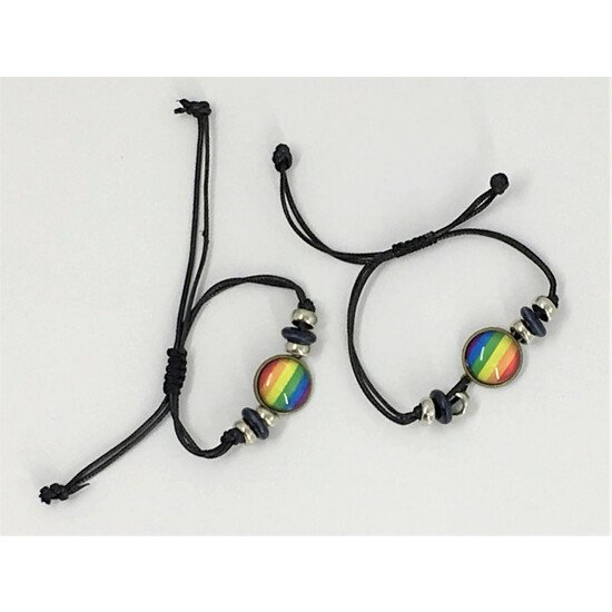 Pulsera hilo negro con un circulo central con los colores del orgullo muy llamativos, con los colores definidos del orgullo gay, valida para cualquier medida.