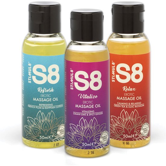 Los aceites de masaje S8 son fantásticos y son una combinación única, están enriquecidos con 3 aceites esenciales: aceite de jojoba que calma y fortalece la piel, aceite de almendras que hidrata y cuida la piel, aceite de sésamo altamente nutritivo además de lubricante.