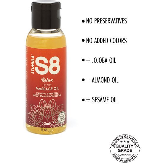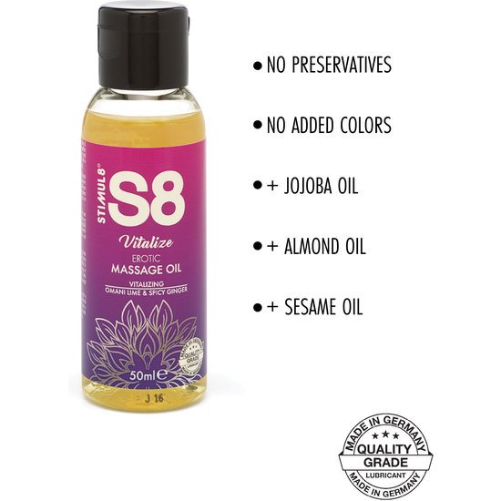 El aceite S8 está enriquecido con vitaminas y minerales esenciales. Después de un buen masaje sentirás tu piel sedosa, suave y relajada.