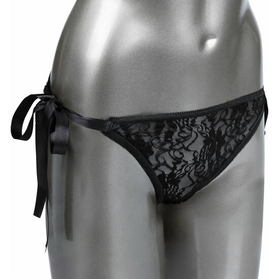 Cuando o donde la pasión te lleve, las 12 intensas funciones de vibración de este apasionado mini vibrador están listas para jugar. Las bragas de encaje sexys y elásticas cuentan con un discreto bolsillo interno de satén con lazos laterales para el bolsillo perfecto del estimulador.