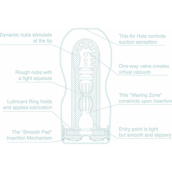 Su forma de reloj de arena proporciona un ajuste sublime. Una válvula de vacío y una salida de aire en su extremo para regular el nivel de succión, producen una experiencia dulcemente pegajosa. Una experiencia de felación completamente real. Además su realista sonido aporta un plus de estímulo.