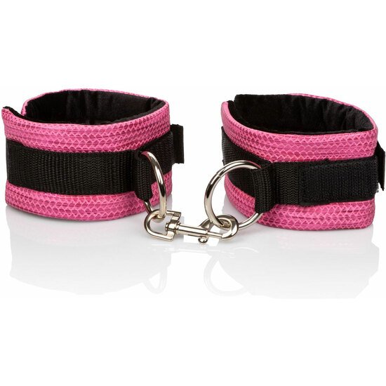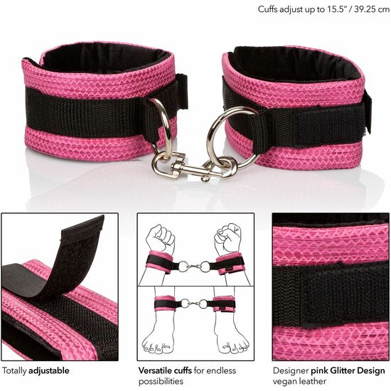 Déjate llevar por el éxtasis puro al deslizar estos puños de cuero vegano rosa brillante. Explora las infinitas posibilidades de sujeción con correas de velcro ajustables y dos cierres universales. Coloca los puños versátiles entre sí o alrededor de los postes de la cama para ceder el control total a tu amante y aumentar el placer.