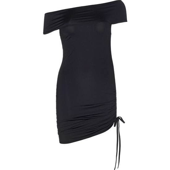 Vestido de hombros descubiertos con fruncido en la parte inferior.